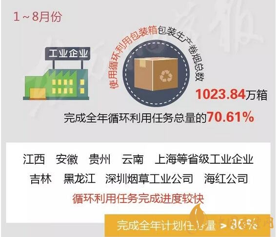 工業(yè)企業(yè)累計使用循環(huán)利用包裝箱包裝生產(chǎn)卷煙1023.84萬箱,完成全年循環(huán)利用任務(wù)總量的70.61%。其中,浙江、重慶、安徽、江蘇、福建、云南、北京等省級商業(yè)企業(yè)總體返還比例較高,返還率均超過100%;江西、安徽、貴州、云南、上海等省級工業(yè)企業(yè)及中國煙草實業(yè)發(fā)展中心所屬吉林、黑龍江、深圳煙草工業(yè)有限責任公司和海南紅塔卷煙有限責任公司循環(huán)利用任務(wù)完成進度較快,已累計完成全年計劃任務(wù)量的80%以上。