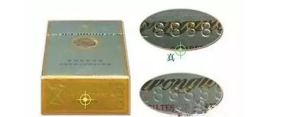 (2)看防偽標(biāo)記:條盒的正面芙蓉花防偽標(biāo)記,真煙的印刷在同一側(cè)面看到的只有一個(gè)圖樣;假煙的印刷在同一側(cè)面看到是幾個(gè)在一起的圖樣。
