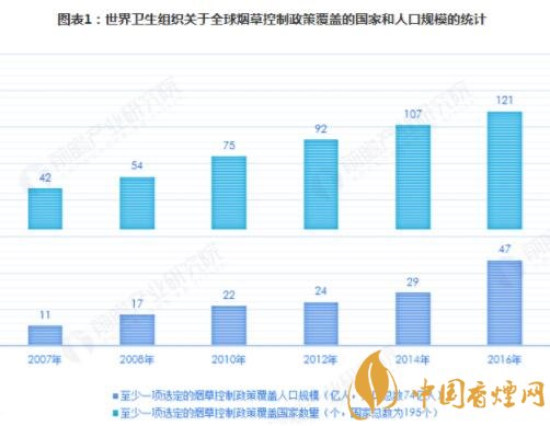 世界衛(wèi)生組織(World Health Organization,簡(jiǎn)稱WHO)發(fā)布的主題為監(jiān)測(cè)煙草使用與預(yù)防政策《2017年全球煙草流行報(bào)告》顯示,當(dāng)前全球控?zé)熣叩母采w面繼續(xù)擴(kuò)大,全球共有121個(gè)國(guó)家共47億人口(全球近三分之二的人口)受到控?zé)熣叩挠绊?,目前仍?4個(gè)國(guó)家共27億人未受到控?zé)熣叩母采w。此外,雖然部分國(guó)家和地區(qū)的卷煙消費(fèi)量有所下滑,全球卷煙消費(fèi)的增速放緩,但全球吸煙人口數(shù)量仍在不斷增加。