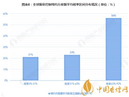 據(jù)統(tǒng)計(jì),在全球煙草控制締約方實(shí)施煙草稅收政策的國(guó)家中,稅率在63%-90%高稅率的國(guó)家數(shù)量占到了56%;實(shí)施31%-63%稅率的締約方數(shù)量也占到了23%;31%以下稅率的締約方數(shù)量占比為21%。