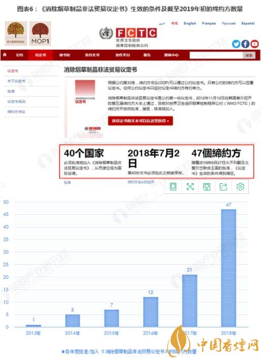 世界衛(wèi)生組織還積極推動(dòng)《消除煙草制品非法貿(mào)易議定書》簽訂生效。按照2012年通過該議定書時(shí)的約定,《議定書》需要40個(gè)締約方可生效,《議定書》將在第40份文書被保存后第90天起生效。根據(jù)世界衛(wèi)生組織煙草控制框架公約發(fā)布的情況,隨著2018年6月27日大不列顛及北愛爾蘭聯(lián)合王國(guó)的批準(zhǔn),《議定書》生效的條件得到滿足。目前,議定書締約方數(shù)量已經(jīng)達(dá)到47個(gè)。