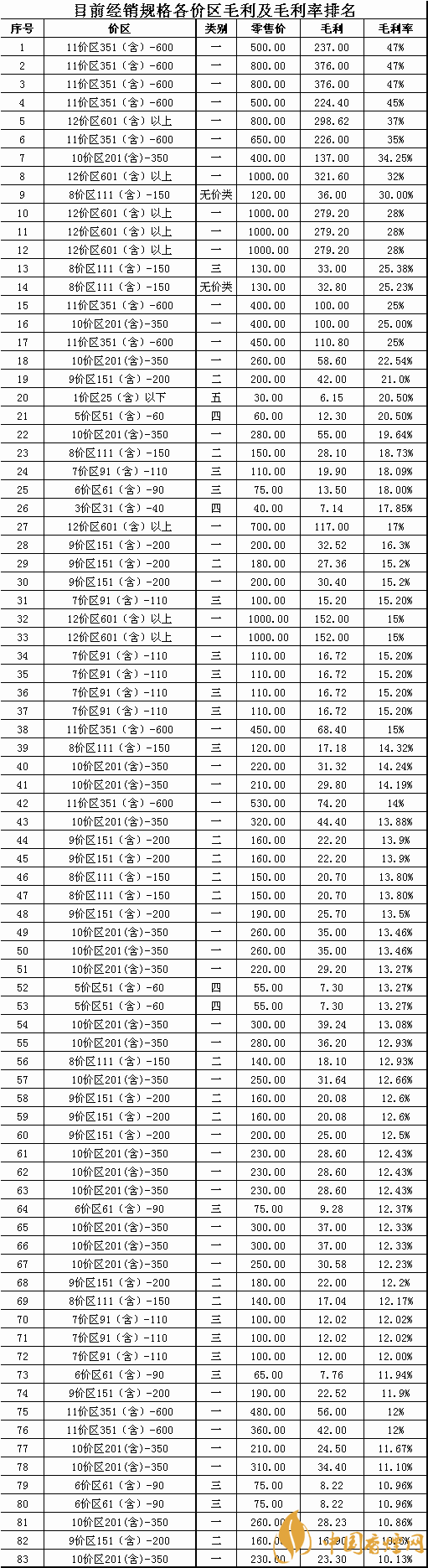 注:從目前全市經(jīng)銷的83個品牌批零差價可以看出,單品牌規(guī)格毛利率低于11%的僅有5個規(guī)格且全部高于10%的毛利率,部分溢價的規(guī)格產(chǎn)品毛利率已經(jīng)接近了50%,卷煙規(guī)格的平均毛利率達到了17.97%,然而這都預期的毛利,為什么真實的現(xiàn)狀是我們賺不到這應該屬于我們自己的毛利率和毛利,是值得每一個卷煙經(jīng)營者深思和考慮的問題?為了保障大家的合法利益我們隱藏了商品名稱和商品編碼,有經(jīng)驗的零售客戶對照價區(qū)和商品獲利水平就可以清晰的對商品進行定位,具體對應商品規(guī)格請參照2019版《卷煙零售客戶服務手冊》卷煙價格一覽表有詳解。