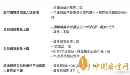 港海關(guān)規(guī)定,每個(gè)人最多可以攜帶19只香煙。超過(guò)規(guī)定數(shù)量,需要申報(bào)并且上稅。香港法律規(guī)定未申報(bào)超額香煙最高可判處監(jiān)禁2年、罰款100萬(wàn)港幣。