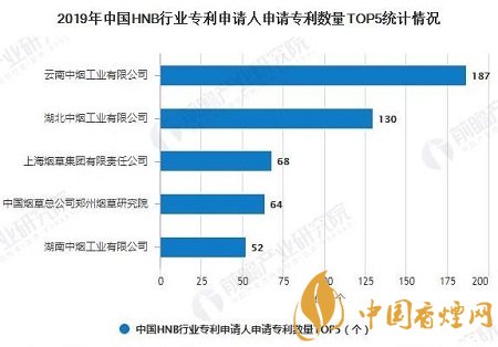 盡管我國現(xiàn)在暫未通過加熱不燃燒煙的銷售批準(zhǔn),但通過在Soopat上對“加熱不燃燒煙”的搜索,截至2019年年底,我國中煙集團(tuán)已經(jīng)加快加熱不燃燒煙相關(guān)領(lǐng)域的研發(fā),其中我國云南中煙工業(yè)有限公司對加熱不燃燒煙的申請數(shù)量最多,為187個(gè),緊隨其后的是湖北中煙工業(yè)有限公司,申請數(shù)量130個(gè)。