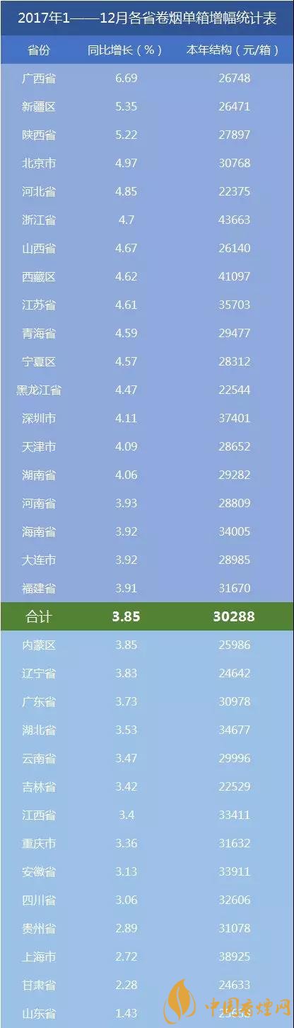 2017全國(guó)卷煙銷量增幅情況: