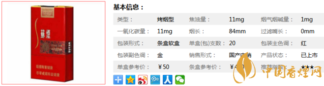 | 類型 :烤煙型 | 焦油量 :11mg | 煙氣煙堿量 :1mg | 一氧化碳量 :11mg |