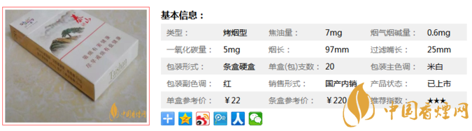 | 類型 :烤煙型 | 焦油量 :7mg | 煙氣煙堿量 :0.6mg | 一氧化碳量 :5mg |
