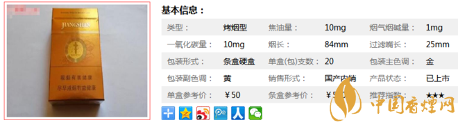 “江山”牌低危害卷煙由于采用不斷完善的中草藥提取液,每支煙中含有0.5%的“仙芪補(bǔ)腎顆粒”新型料液,除了低害特征外,最大的成功是理想地解決了低危害卷煙中的幾個常見問題,如卷煙品質(zhì)至上、煙藥協(xié)調(diào)、口感余味、有效成分轉(zhuǎn)移等。下面我們一起來看江山一統(tǒng)香煙的參數(shù)信息:焦油量:10mg 煙堿量:1mg 一氧化碳量:10mg