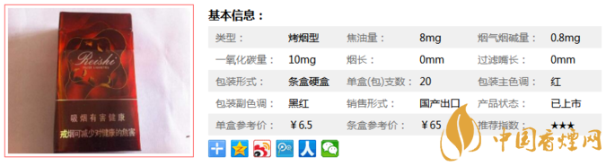 | 類型 :烤煙型 | 焦油量 :8mg | 煙氣煙堿量 :0.8mg | 一氧化碳量 :10mg |
