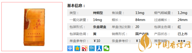 | 類型 :烤煙型 | 焦油量 :13mg | 煙氣煙堿量 :1.2mg | 一氧化碳量 :14mg |