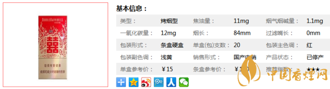 | 類型 :烤煙型 | 焦油量 :11mg | 煙氣煙堿量 :1.1mg | 一氧化碳量 :12mg |