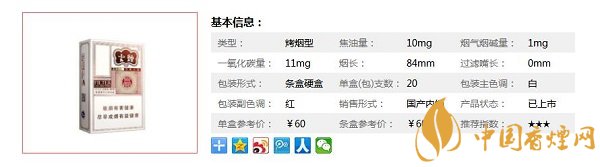 | 類型 :烤煙型 | 焦油量 :10mg | 煙氣煙堿量 :1mg | 一氧化碳量 :11mg |