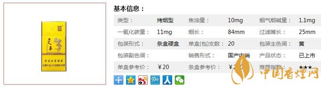 類型 :烤煙型 焦油量 :10mg 煙氣煙堿量 :1mg 一氧化碳量 :10mg