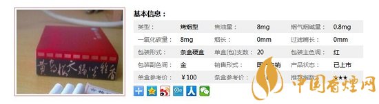 類型 :烤煙型 焦油量 :8mg 煙氣煙堿量 :0.8mg 一氧化碳量 :8mg