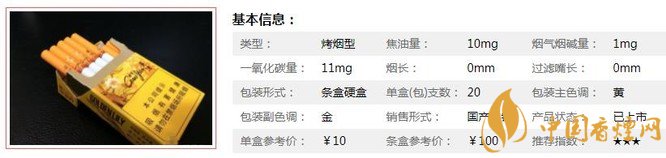 | 類(lèi)型 :烤煙型 | 焦油量 :10mg | 煙氣煙堿量 :1mg | 一氧化碳量 :11mg |