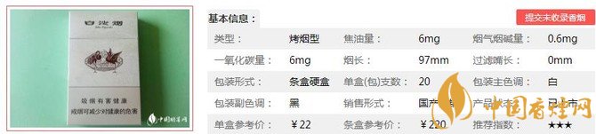 | 類型 :烤煙型 | 焦油量 :6mg | 煙氣煙堿量 :0.6mg | 一氧化碳量 :6mg |