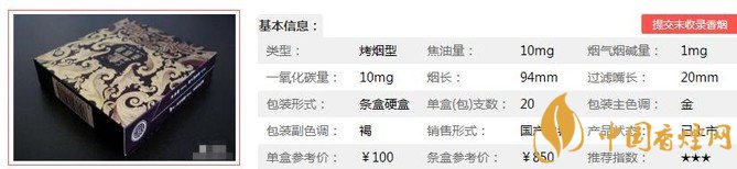 類型 :烤煙型 焦油量 :10mg 煙氣煙堿量 :1mg 一氧化碳量 :10mg