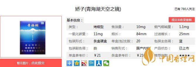 嬌子青海湖天空之鏡的包裝十分精致美觀,是一款令很多煙民因顏值而心動(dòng)行動(dòng)的香煙,但這款香煙地域性太強(qiáng),以至于很多煙民都沒(méi)有見(jiàn)過(guò)。經(jīng)香煙網(wǎng)小編市場(chǎng)調(diào)查嬌子青海湖天空之鏡售價(jià)為21元/包。