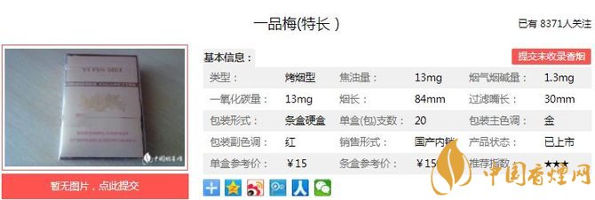 商標(biāo)主色調(diào)為金色,富麗堂皇,氣派尊貴; 香氣濃馥、悠長(zhǎng),煙氣豐滿細(xì)膩,層次感強(qiáng),余味干凈舒適,口感純正,入喉舒適和順; 30mm超長(zhǎng)濾嘴,有效降低煙氣中焦油、一氧化碳等有害物質(zhì)。經(jīng)香煙網(wǎng)小編市場(chǎng)調(diào)查一品梅特長(zhǎng)售價(jià)為15元/包。