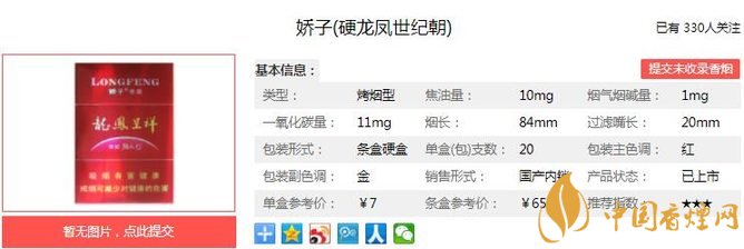 嬌子硬龍鳳世紀(jì)朝煙支長84mm,過濾嘴長20mm,金色內(nèi)襯紙紋路非常細(xì)膩,煙支7-6-7排列,煙嘴印有紅色龍鳳呈祥和金色世紀(jì)朝字樣。下面我們一起來看嬌子硬龍鳳世紀(jì)朝的參數(shù)信息:焦油量:10mg 煙堿量:1.0mg 一氧化碳量:11mg