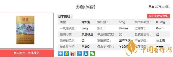 蘇煙沉香,其價位應該是細支香煙中最高的品牌香煙。蘇煙沉香香氣優(yōu)雅協(xié)調,沉香香氣獨特、高雅,且與煙草本香完美融合,煙氣細膩,濃度和勁頭適中、口感舒適生津。經(jīng)香煙網(wǎng)小編市場調查蘇煙沉香售價為100元/包。
