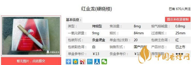 紅金龍硬曉樓具備中式烤煙的香氣特征,兼具國際流行的低焦油和淡雅口感,兼容中西優(yōu)良卷煙特質,口感醇和雅致,香氣飽滿,入口順暢。經香煙網小編市場調查紅金龍硬曉樓售價為13元/包。