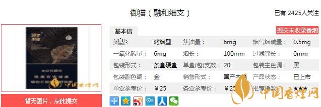 御貓融和細支煙支長100mm,過濾嘴長35mm,金色的御貓,以及具有藝術(shù)感的,變形的融和字樣,印制于過濾嘴紙張之上,煙絲色澤金黃。下面我們一起來看御貓融和細支的參數(shù)信息:焦油量:6mg 煙堿量:0.5mg 一氧化碳量:6mg