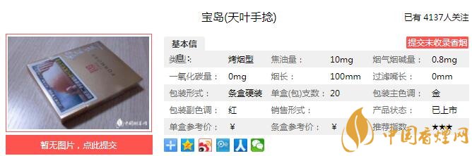 寶島(天葉手捻)也叫寶島(國際版),據(jù)說在臺(tái)灣并不是很常見的產(chǎn)品,而在臺(tái)灣機(jī)場(chǎng)免稅店賣的還不錯(cuò)的,是為大陸游客開發(fā)設(shè)計(jì)的產(chǎn)品。下面就由香煙網(wǎng)小編帶大家一起來了解寶島天葉手捻的相關(guān)信息。
