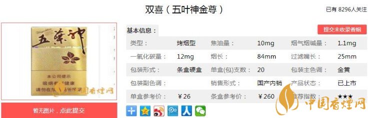 雙喜(五葉神金尊)嗅香煙草本香突出,無明顯非煙草氣息。關(guān)鍵的是這款香煙的降焦也是比較明顯的,但是依然能夠保持煙香濃郁,這是非常難得的。下面便是這款香煙的基本參數(shù)如下:焦油量:10mg 煙堿量:1.1mg 一氧化碳量:12mg.