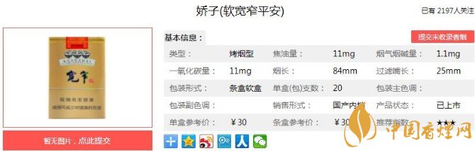 綜合來說嬌子(寬窄平安)的質(zhì)量還是可以保證的。它有著寬窄系列香煙傳統(tǒng)的口感和味道,細(xì)膩而香醇。只是相比其它款式的寬窄,在某一品評指標(biāo)上,稍有些差距。但是橫向比對相同價(jià)位其它品牌的香煙,平安的優(yōu)勢,還是存在的,售價(jià)在30元一包。