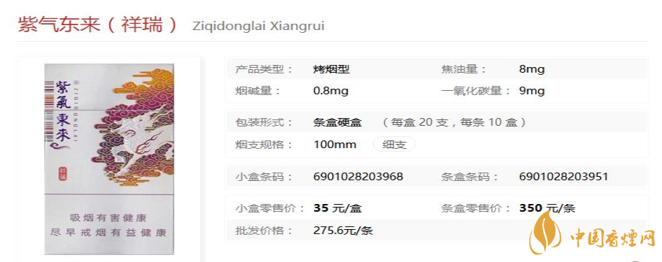 紫氣東來祥瑞煙支長(zhǎng)100mm,過濾嘴長(zhǎng)35mm,定位在細(xì)支煙品類。通過采用低溫保香,多級(jí)復(fù)配等特色工藝,使產(chǎn)品煙草本香更加突出,抽吸的均勻性更加穩(wěn)定,使消費(fèi)者在享受煙草香氣的同時(shí),又能體味自然舒適的感覺。下面我們一起來看紫氣東來祥瑞的參數(shù)信息:焦油量:8mg煙堿量:0.8mg一氧化碳量:9mg。