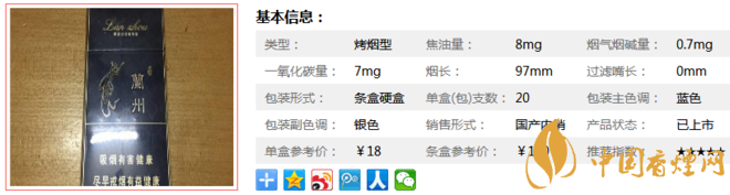 | 類型 :烤煙型 | 焦油量 :8mg | 煙氣煙堿量 :0.7mg | 一氧化碳量 :7mg |