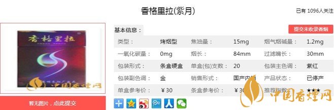 香格里拉紫月用料考究,加工精細(xì)品質(zhì)出眾,是昆煙繼云煙珍品之后推出的又一高品質(zhì)產(chǎn)品。這款煙包裝漂亮,煙氣醇厚、本香十足,給力的15焦給人較強(qiáng)的滿(mǎn)足感,但煙氣的順滑度較差,入口有辣感,目前已經(jīng)停產(chǎn)下市。經(jīng)香煙網(wǎng)小編市場(chǎng)調(diào)查香格里拉紫月售價(jià)為30元/包。