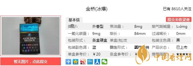 金橋(冰爆)是薄荷味的爆珠,在這款香煙之前,薄荷味爆珠產(chǎn)品嬌子一直占據(jù)主要市場。金橋(冰爆)后來居上,薄荷煙清涼潤喉,對長期吸食卷煙的消費者來說,有新鮮感。經(jīng)香煙網(wǎng)小編市場調(diào)查金橋冰爆售價為20元/包。