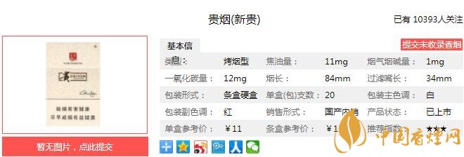 貴煙新貴產(chǎn)品類型:烤煙型、焦油量:11mg、煙堿量:1.0mg、一氧化碳量:12mg、包裝形式:條盒硬盒(每盒 20 支,每條 10 盒)、煙支規(guī)格:84mm。