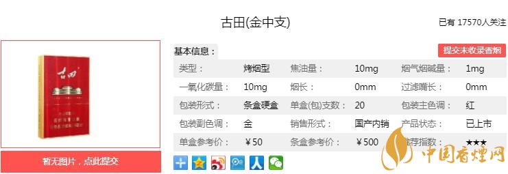 古田金中支煙支長84mm,過濾嘴長25mm,定位在中支煙品類。捏一捏煙支,煙絲填充飽滿,切口整齊,仔細(xì)觀察并沒有發(fā)現(xiàn)降焦孔。下面我們一起來看古田金中支的參數(shù)信息:焦油量:10mg 煙堿量:1.0mg 一氧化碳量:10mg