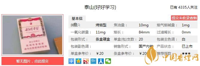 白沙出了款“天天向上”香煙,泰山的“好好學(xué)習(xí)”香煙緊隨其后遙相呼應(yīng)。泰山好好學(xué)習(xí)充分利用香精香料在卷煙中增香、保潤的雙重作用,采用傳統(tǒng)漿果類香料及進(jìn)口蜂蜜提高舒適性和甜潤感,采用少量天然植物提取物豐富增香和調(diào)節(jié)煙氣狀態(tài),利用少量進(jìn)口煙草提取物對(duì)香氣風(fēng)格進(jìn)行強(qiáng)化。下面就由香煙網(wǎng)小編帶大家一起來了解泰山好好學(xué)習(xí)的相關(guān)信息。