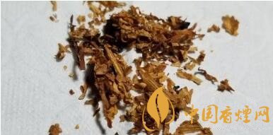 攤開煙絲,油潤紅亮,棕黃色自然陳化的烤煙原片絲占據(jù)80%的比例,間雜有切寬稍細(xì)的深棕色煙絲,煙梗則切得極薄,一般長度在6-7mm左右。用料比較厚道實(shí)在。