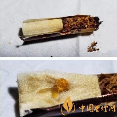剖開濾嘴,是經(jīng)典的一段式醋酸纖維絲束。降焦孔開在了前1/3段,從絲束的顏色變化來看,前段微黃,后段稍淺,顏色變化均勻。也沒有從降焦孔向后的條帶,應(yīng)是煙氣流速稍慢,空氣混合充分的結(jié)果。剖開絲束,可見橙色的爆珠。
