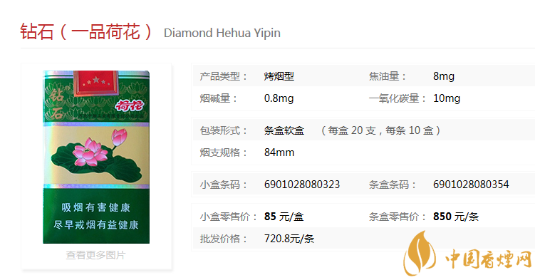 鉆石一品荷花于2014年上市,在高端卷煙市場占用很大的份額,濃淡適中的香氣,勁頭適中成為很多人的口糧。清雅脫俗的包裝設(shè)計(jì)更讓人愛不釋手,經(jīng)香煙網(wǎng)小編市場調(diào)查鉆石一品荷花售價(jià)為80元/包。
