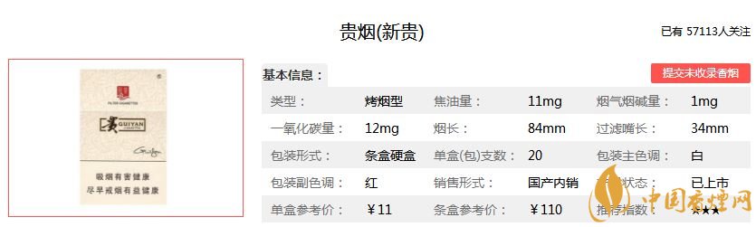 貴煙新貴香煙11元/包,這款煙的焦油含量是11mg,煙氣煙堿含量1.0mg,煙氣一氧化碳含量是12mg,售價適中,深受煙民最愛,口味清爽,煙勁道足。
