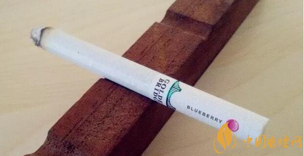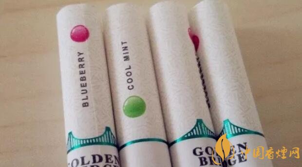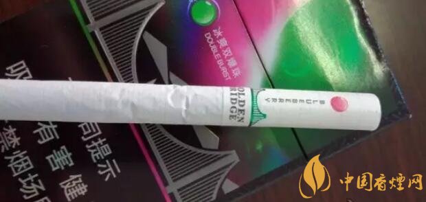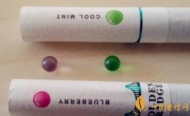 國產(chǎn)爆珠香煙金橋煙支上一道綠箍,一座綠色的金門大橋坐落其上,暗示了這包煙即使不爆珠也自帶的涼味。水松紙上有爆珠示意圖,靠唇端是紫紅色的藍莓,靠煙絲端是翠綠色的薄荷。又要用圓點顯示爆珠位置,又要用英文字母標注爆珠口味,如果同處一側將顯得擁擠,因此二者分居濾嘴兩側錯開。煙支上沒有漢字,GOLDEN BRIDGE、BLUEBERRY和COOL MINT,營造出了外煙的既視感。