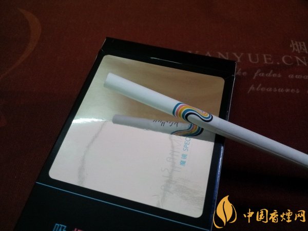 煙支通體純白,白到卷煙紙上連豎的或是橫的紋理都沒有。白色的水松紙上除了阿里山的Logo外,還飄蕩著一條“藍白紅白黃白藍白黑”的“幾”字形絲帶,很是奪目。