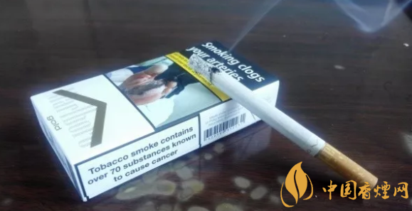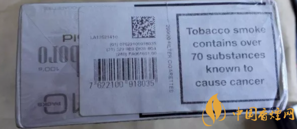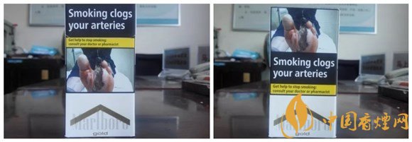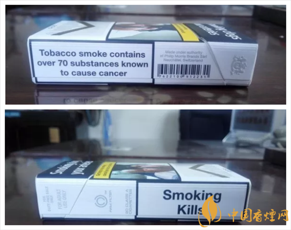 警示圖片的內(nèi)容,與84S紅或白等相同。從樣式上可以看出,它也是一款新版萬(wàn)寶路。與84S系列相同的,是因?yàn)樽屛挥诰緢D片,黑框警示英文字句,轉(zhuǎn)而移到煙盒的左右側(cè)面。#p#副標(biāo)題#e#