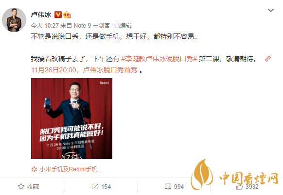 今日,盧偉冰發(fā)微博表示,將會在Note 9發(fā)布會上以脫口秀的方式來聊一聊Redmi和Note系列。