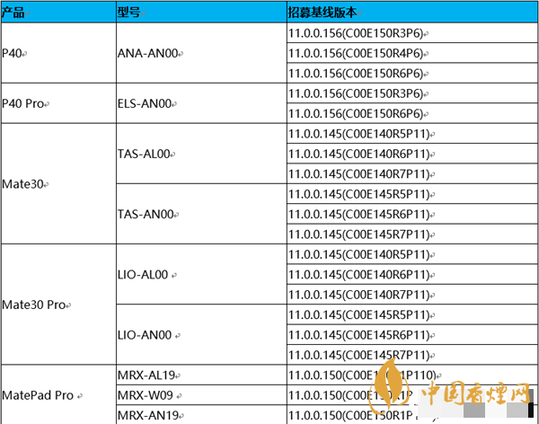 全網通(5G雙卡)P40 、 全網通版P40 Pro、Mate30、Mate30(5G) 、Mate30 Pro、Mate30 Pro(5G),型號清單為ANA-AN00、ELS-AN00、TAS-AL00、TAS-AN00、LIO-AL00、LIO-AN00 。