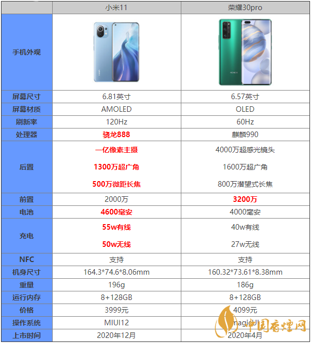 小米11作為今年最強機型,許多小伙伴對這款手機都十分關(guān)注,那么這款手機和榮耀30pro這兩款手機的區(qū)別是什么?哪款手機更值得入手?下面香煙網(wǎng)小編為大家?guī)碜钚碌男∶?1和榮耀30pro參數(shù)對比,感興趣的朋友快來看看吧。