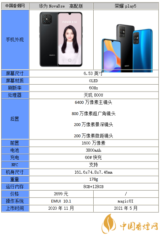 以上就是小編收集到的榮耀play5和華為nova8se高配版本區(qū)別在哪-應(yīng)該買哪個的相關(guān)內(nèi)容,以上內(nèi)容均來源于網(wǎng)絡(luò),僅供參考,一切以實際為準(zhǔn),更多最新數(shù)碼資訊請關(guān)注香煙網(wǎng)。