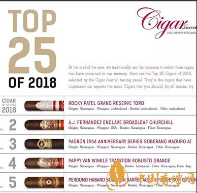 雪茄愛(ài)好者看過(guò)來(lái),2018年雪茄排行榜來(lái)了!2018年排名前十的雪茄有哪些呢?《cigarjournal》組織了品鑒小組評(píng)選出2018年前25名雪茄,品鑒小組由來(lái)自世界各地的70名雪茄愛(ài)好者和專(zhuān)家組成,涵蓋各個(gè)年齡層的女性和男性。下面就由香煙網(wǎng)小編帶大家一起來(lái)了解一下2018年雪茄排行榜的相關(guān)信息。