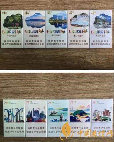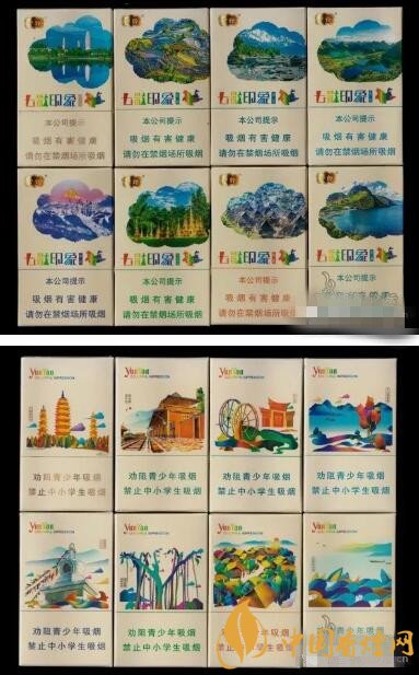 5包裝的云煙•七彩印象,深邃的藍(lán)色外包裝禮盒,滿布各種云南的特色圖紋—大象、蝴蝶、大水車、石林等等,煙包圖案是五城五景,同時(shí)也是五彩五味,分別為:昆明版(玫瑰味)、大理版(梅子味)、麗江版(原味)、西雙版納版(芒果味)和保山版(咖啡味)。